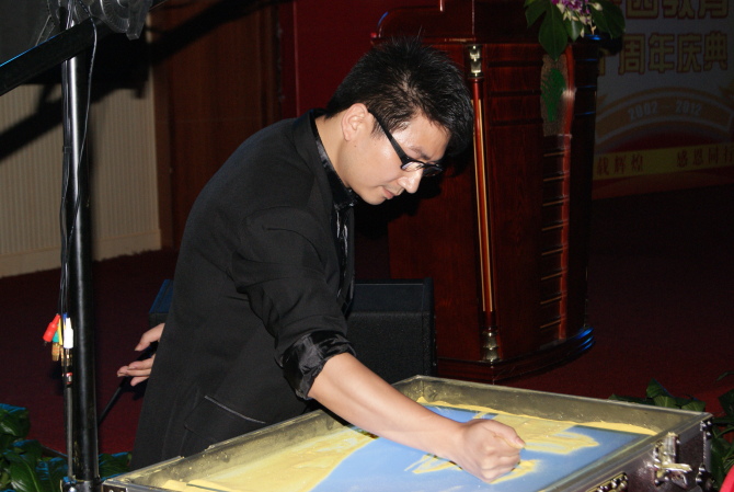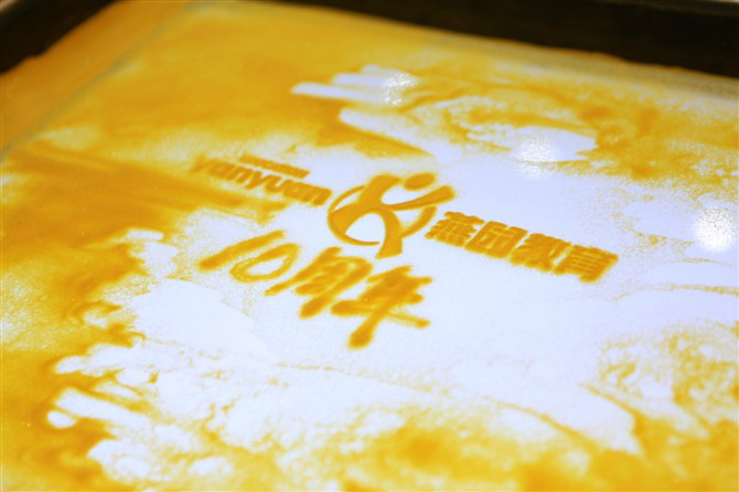 妙曼的身姿,刚劲有力击鼓声,加上绚丽的LED灯和舞台灯光的强烈配合,现场气氛瞬间沸腾起来。主持人宣布"携手前行,再续辉煌——燕园教育十周年庆典" 活动正式开始,展现燕园十年发展历程的沙画表演登场。(李泰山沙画)灯光昏暗,只剩LED电子大屏幕上放射的光芒。音乐舒缓柔和,主持人配合着沙画师勾画出的一幅幅场 景,述说着燕园从十年前呱呱坠地到如今翘首屹立于华南地区专硕培训领域的佼佼者的动人经历,如诗如画,吟唱着燕园十年成长的点滴记忆……